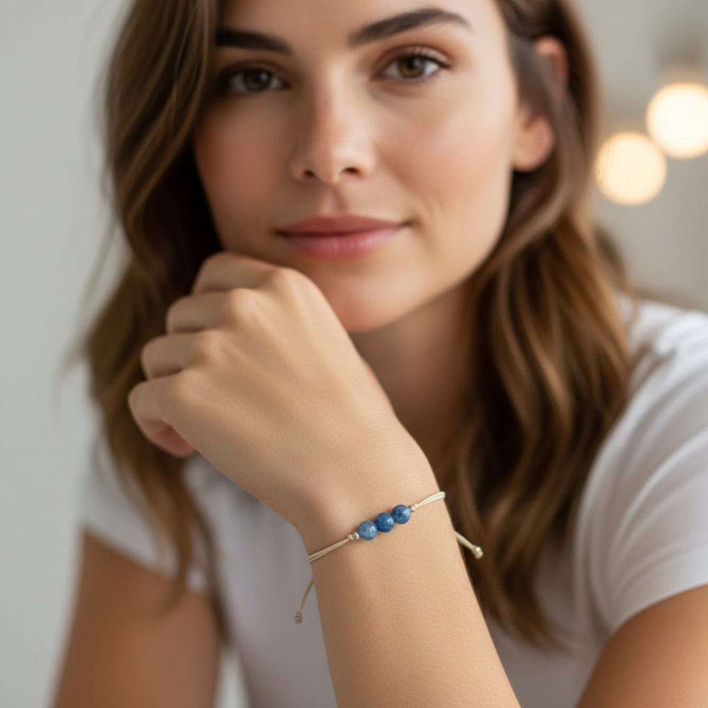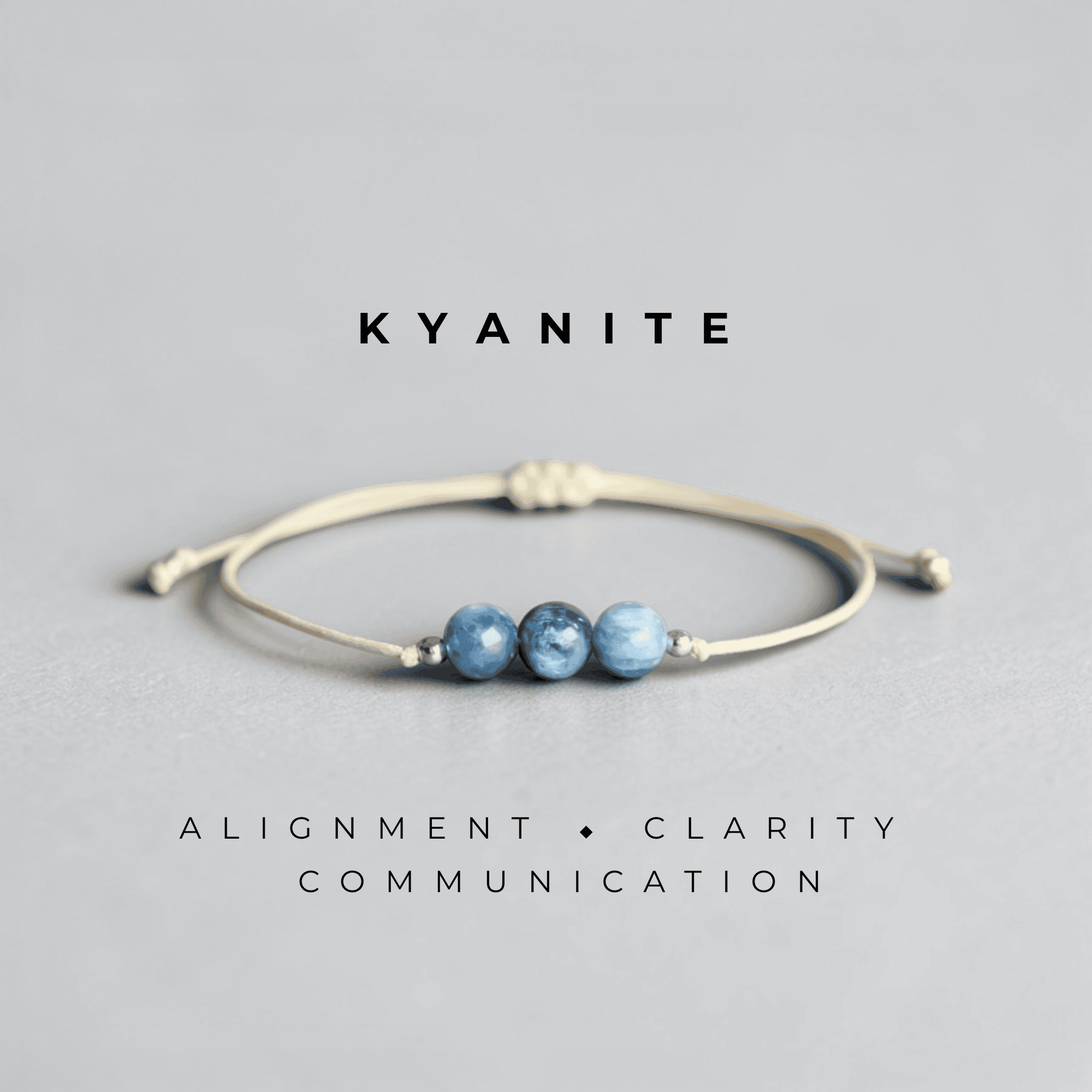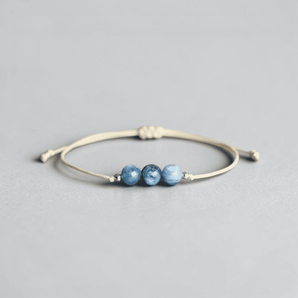 The Kyanite Bracelet is for the ones who are done playing small. Three rich, ocean-blue Kyanite beads sit at the centre of a soft cream adjustable cord, flanked by silver accent beads — simple, striking, and deeply intentional. Kyanite is one of the rare stones that never needs cleansing; it neither accumulates nor retains negative energy. Just pure, uninterrupted alignment. Wear it when you need to speak clearly, think sharply, and show up as your most authentic self.
