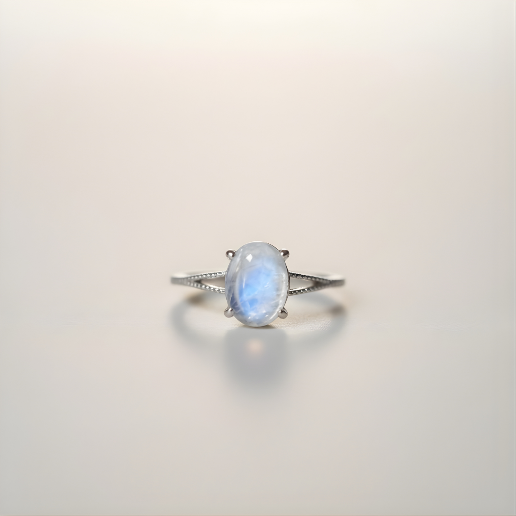 When the light hits the stone, it reveals a mesmerizing blue flash (adularescence) that mimics the ethereal glow of moonlight on water. Set in a delicate, silver-plated band with a split-shank design, this ring balances modern elegance with ancient mystique.