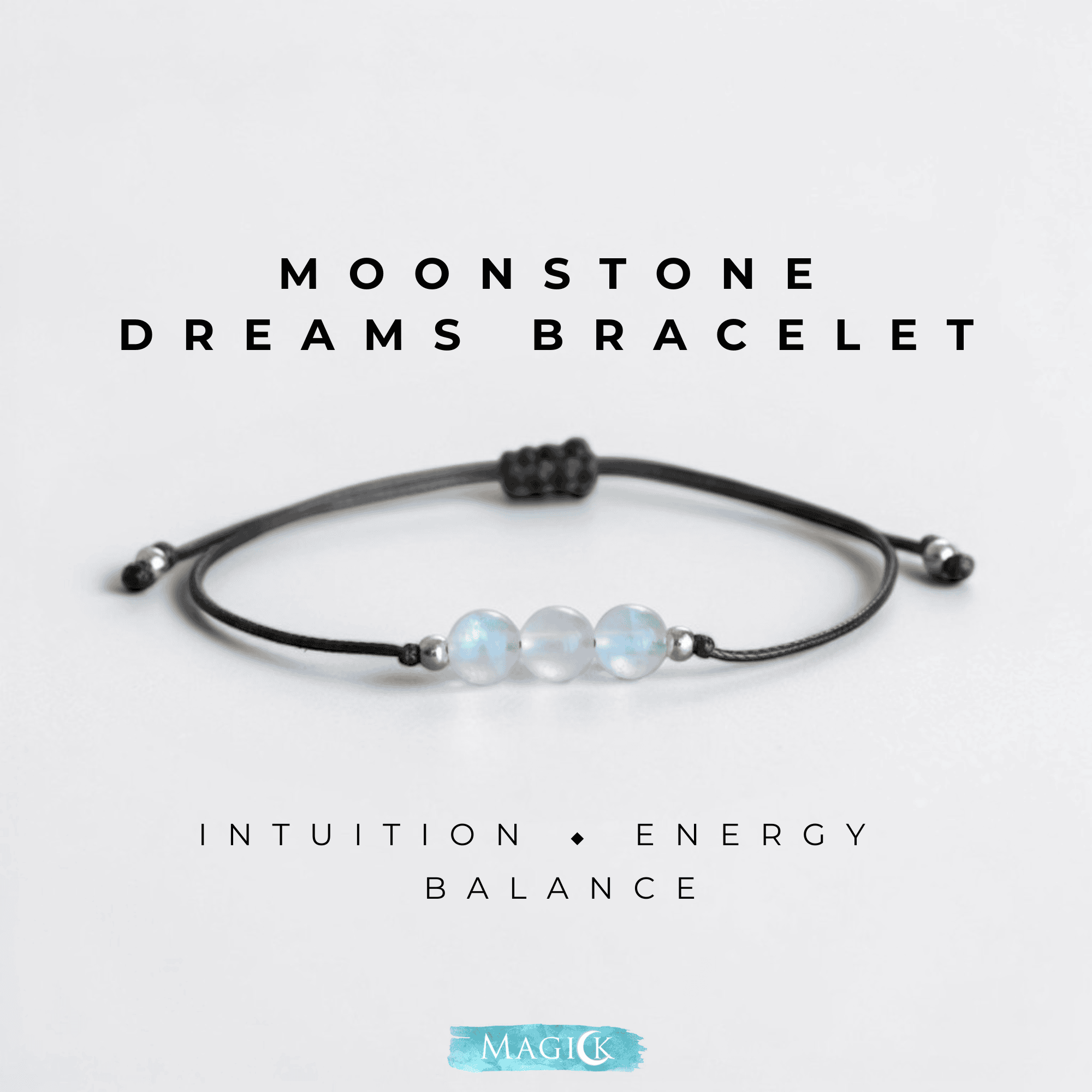 The Build: Smooth Moonstone beads with silver accent beads on a durable adjustable black cord — minimal, elegant, and built for everyday wear.