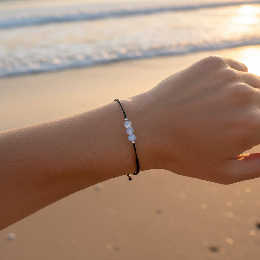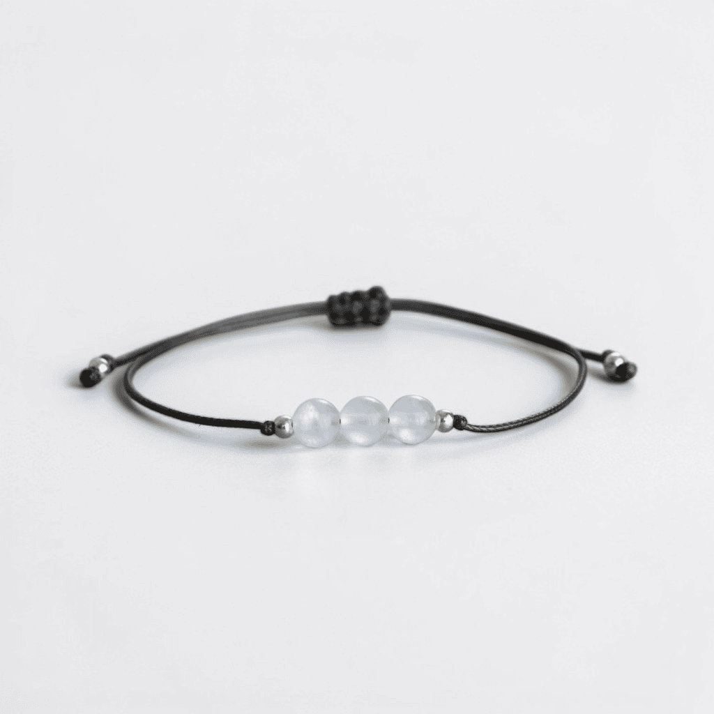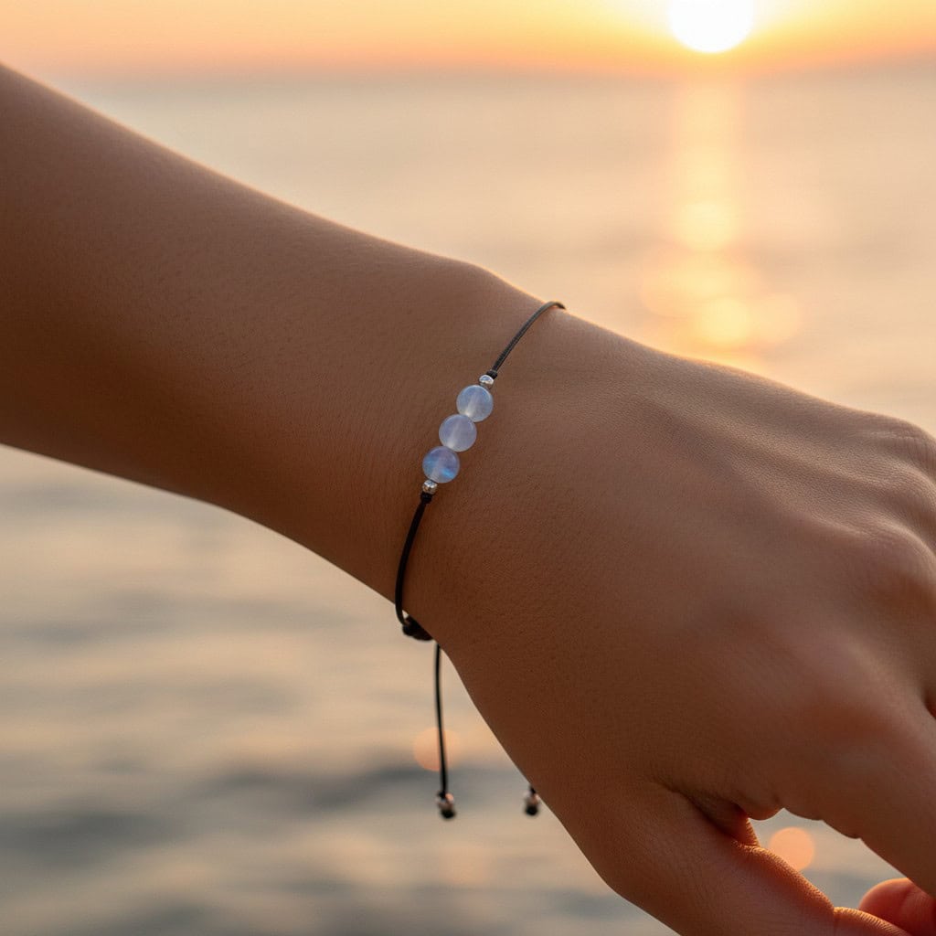 Soft as moonlight, quiet as midnight — the Moonstone Dreams Bracelet carries the gentle but powerful energy of one of the most beloved stones in the crystal world. Three luminous Moonstone beads rest at the centre of a sleek black adjustable cord, glowing with an ethereal blue-white adularescence that seems to shift and breathe like the moon itself. Understated in design, deeply intentional in energy.