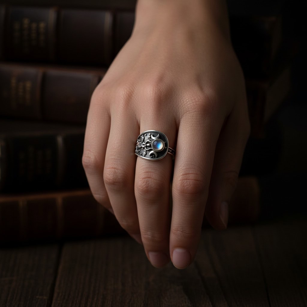 -34%She rises. She reigns. She rests. The Triple Moon Goddess Ring wraps the full story of the divine feminine around your finger — crescent moons, scattered stars, and a glowing moonstone zircon set in oxidised sterling silver.