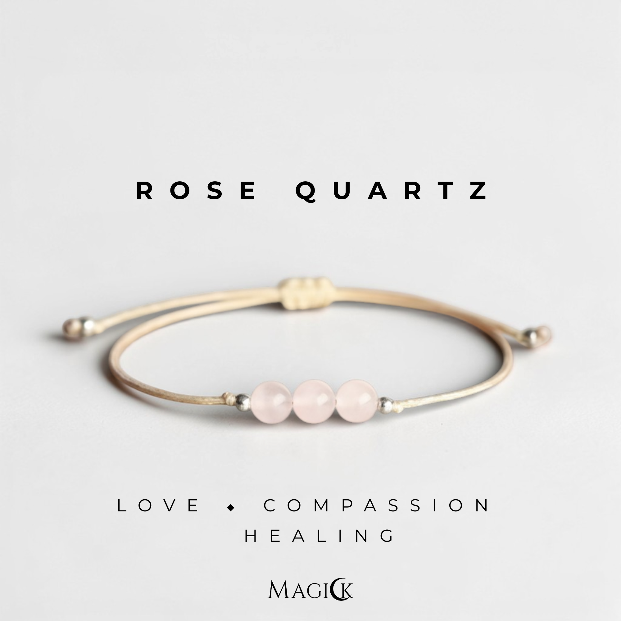 Lead with love. Three blush-pink Rose Quartz beads on a soft cream cord — the ultimate talisman for opening your heart to love, compassion, and deep emotional healing.