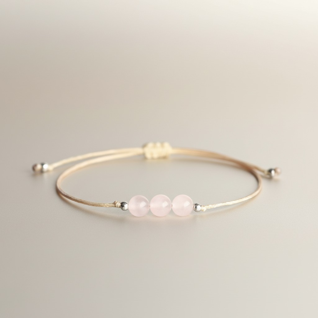 The Rose Quartz Bracelet is the one you reach for when your heart needs a little tenderness. Three softly glowing blush-pink beads rest at the centre of a delicate cream adjustable cord, accented with silver beads — feminine, minimal, and endlessly wearable. Rose Quartz is the stone of unconditional love, and it works in every direction — drawing love in, radiating it outward, and most importantly, turning it gently back toward yourself. Wear it as a daily reminder that you are worthy of the love you so freely give to others.