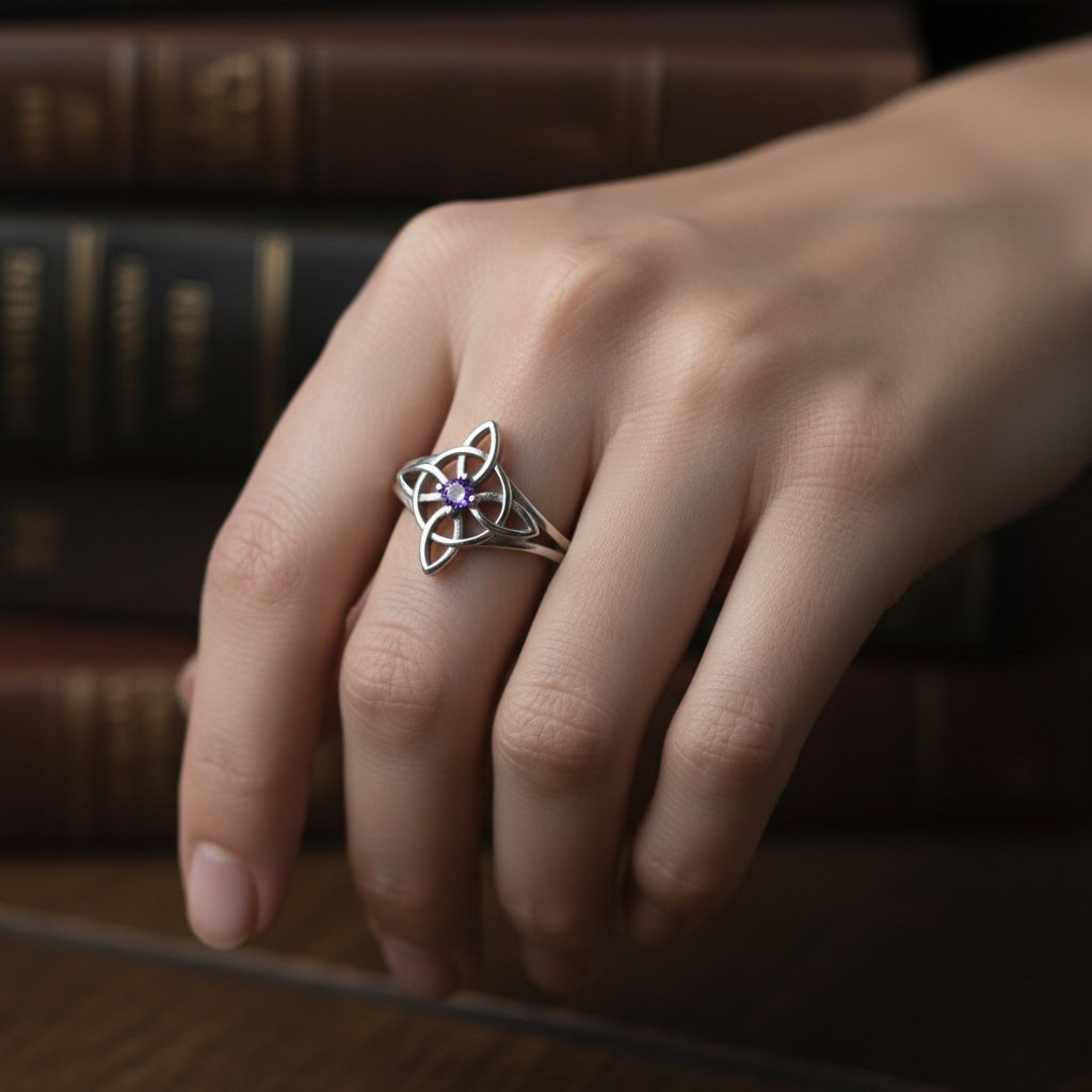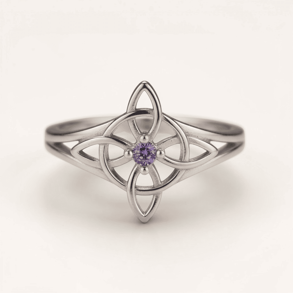 The Witch’s Knot is one of the most powerful protective symbols in folk magic — four interlocking vesica piscis forming a knot with no beginning and no end, believed to bind and repel negative energy while amplifying the wearer’s own magical intention. At the heart of this ring sits a faceted violet zircon, a stone long associated with spiritual wisdom, intuition, and the third eye. The open knotwork design gives this ring an almost ethereal quality — delicate in appearance, yet carrying centuries of protective symbolism in every curve. Crafted in sterling silver with a smooth, comfortable band, it is refined enough for everyday wear and meaningful enough to become a talisman you never take off. For the witches, the wise women, and the ones who have always known there is more to this world than the eye can see.